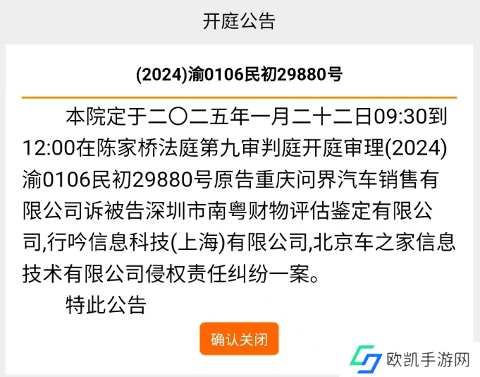 本站 1 月 3 日消息,重庆法院公众服务网今日显示,重庆问界汽车销售有限公司与深圳市南粤财物评估鉴定有限公司、行吟信息科技(上海)有限公司、北京车之家信息技术有限公司相关侵权责任纠纷案件新增开庭公告,原告为重庆问界汽车销售有限公司,该案件将于 1 月 22 日在重庆市沙坪坝区人民法院开庭审理。