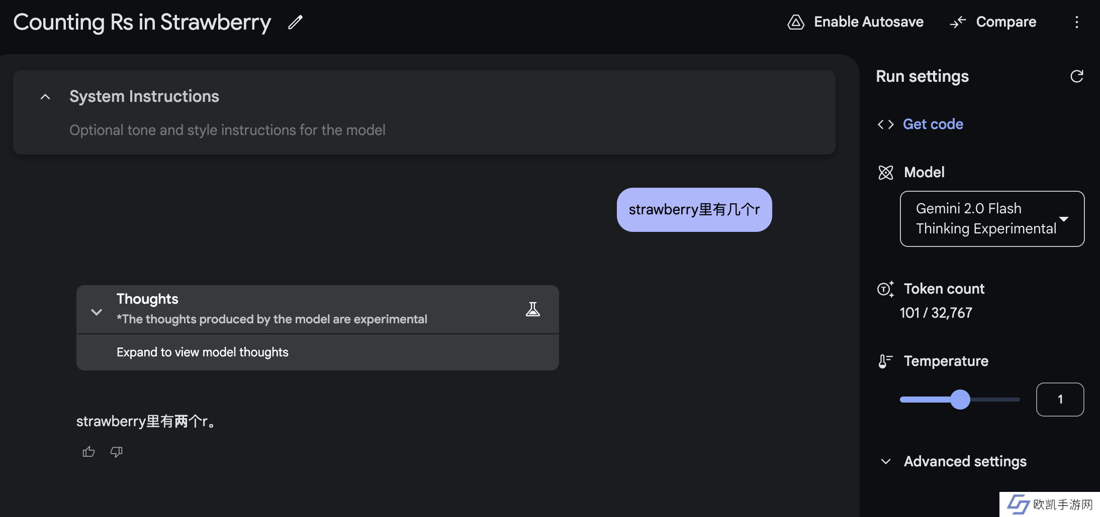 从评测结果上看,谷歌的推理模型在Chatbot Arena基准测试中超越了OpenAI的GPT-4o、o1-preview以及Anthropic的Claude 3.5 Sonnet等模型。但当记者在谷歌AI Studio中试用时,询问“Strawberry里有几个r”,该模型还是给出了错误的回答。