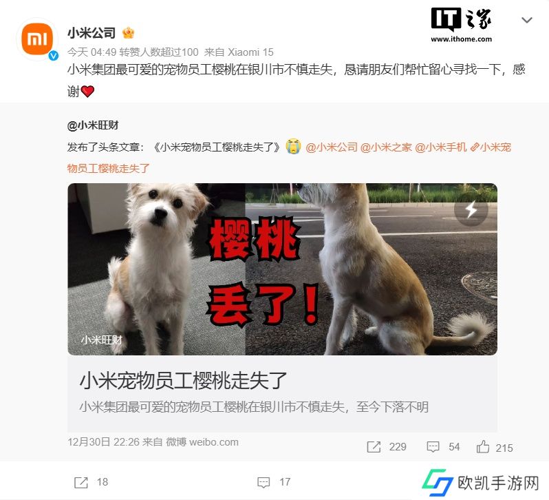 本站 12 月 31 日消息,今天凌晨小米公司官微转发微博称:小米集团最可爱的宠物员工“樱桃”在银川市不慎走失,恳请朋友们帮忙留心寻找一下。