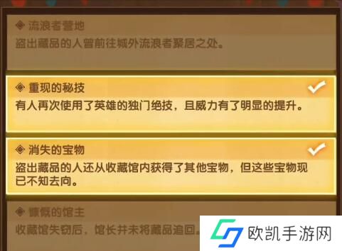 1、首先玩家会得到四条线索,需要选择重现的秘技和消失的宝物这两条。