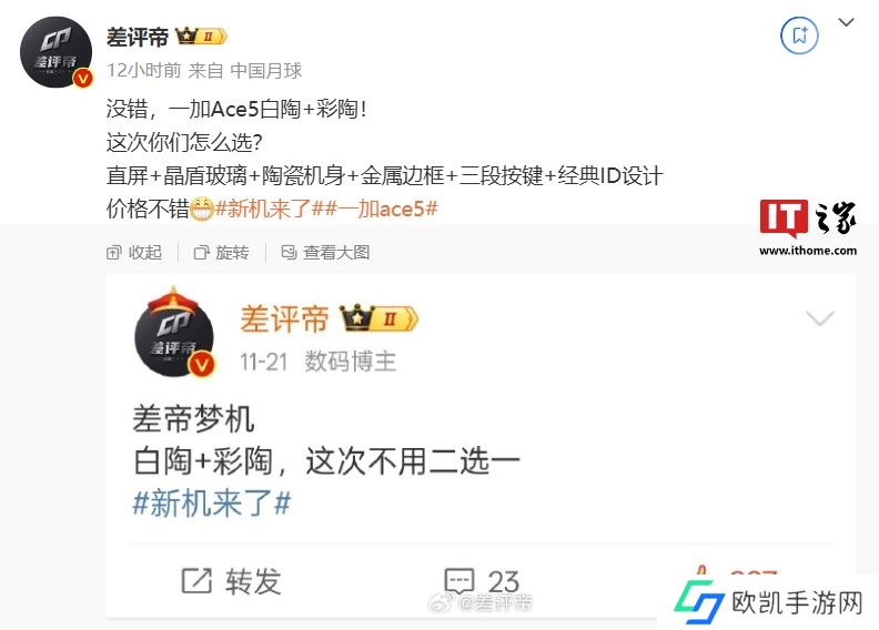 博主 @差评帝 今日发文爆料,一加 Ace 5 手机将采用“白陶 + 彩陶”设计(此处预计为白色陶瓷机身配色和彩色陶瓷机身配色)。该机特点还包括:直屏 + 晶盾玻璃 + 陶瓷机身 + 金属边框 + 三段按键 + 经典 ID 设计。