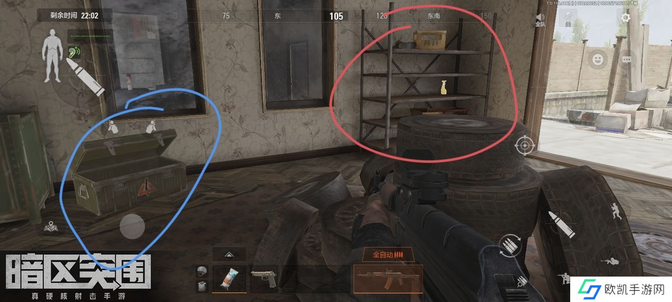 这里右边这个点重点注意一下,偶尔会刷军用电台的(2w+),左边蓝色这个小屋也可以顺手进去,桌子上会刷炮弹(9k+)和各种抛掷武器还有头盔,衣服。