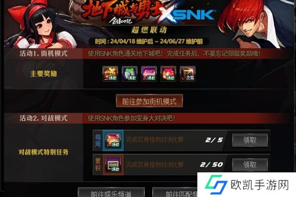 活动期间,各位冒险家可以使用SNK联动角色通关活动地下城完成任务来获得奖励,另外参与DNFxSNK联动怪物变身大对决也有特别奖励