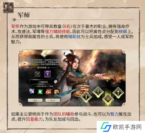 军师:战场上的智者,拥有全面的法术技能和辅助能力。在团队战中,军师的辅助效果极为重要,可以为整个战场提供支援。