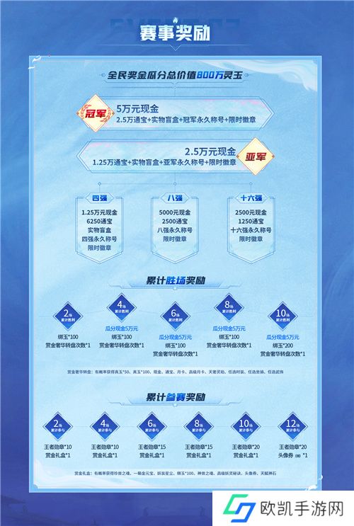 成功跻身决赛阶段的战队将争夺万元现金及海量通宝奖金,冠**伍更可以获得5万元现金奖励、2.5万通宝及专属永久称号,纪念荣誉诞生的一刻!