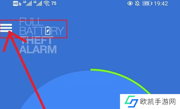 1、首先我们需要先下载电量充满警示闹钟,然后把警示闹钟打开,接着我们点击左上角三条杠的图标。