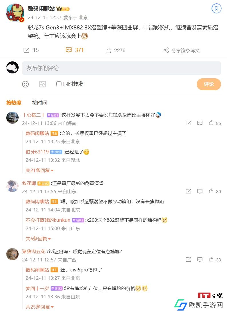 博主在评论区中回复了部分网友的问题:针对后续厂商推出的新机“长焦”镜头是否越来越重要,博主称“会的,长焦权重已经超过主摄了”;针对新机长焦配置(网友称是绿厂最新的倒置潜望),博主回复“嗯,欧加系这颗潜望不做浮动镜组,没有长焦微距”;针对小米 Civi 系列手机后续计划,博主表示“出,Civi 5 Pro 摸过了”。