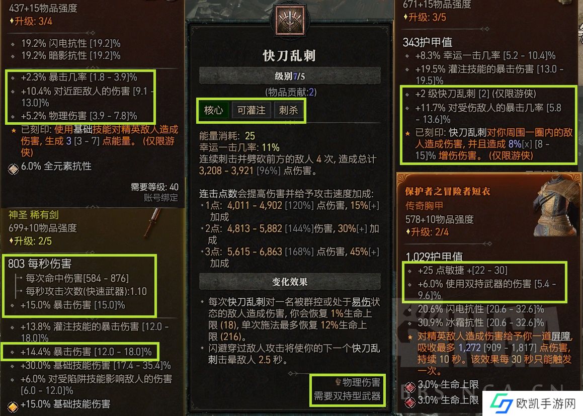 2、比如我的游侠核心技能选择了快刀乱刺,标签是:核心、可灌注(游侠的BUFF技能增强方式)、刺杀。技能伤害首先受技能等级影响,其次受游侠主属性敏捷和技能标签影响。