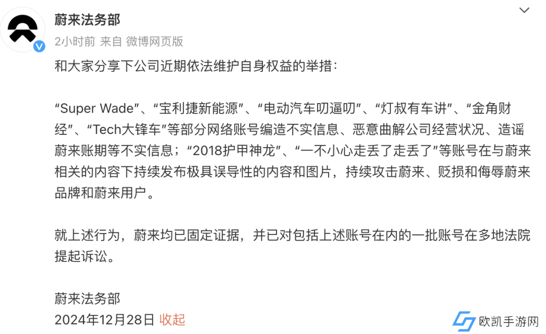 12月28日,蔚来法务部发布消息称,“Super Wade”“宝利捷新能源”“灯叔有车讲”“金角财经”“Tech大锋车”等部分网络账号编造不实信息、恶意曲解公司经营状况、造谣蔚来账期等不实信息;“2018护甲神龙”“一不小心走丢了走丢了”等账号在与蔚来相关的内容下持续发布极具误导性的内容和图片,持续攻击蔚来、贬损和侮辱蔚来品牌和蔚来用户。