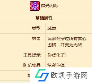 4、玩家若浸没在微光中或钓竿浮标碰到微光时,将受到微光闪烁减益,导致无法移动或使用物品,不过不会受到非boss攻击的伤害,并会向下穿过实心图格,直到到达一个2×3大小的空地或地狱地层。使用炫彩斗篷可更好地控制微光闪烁。