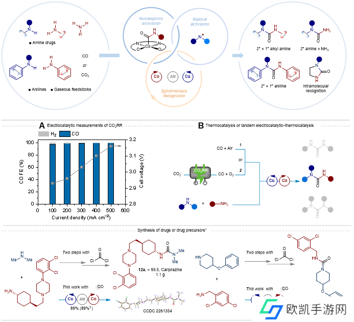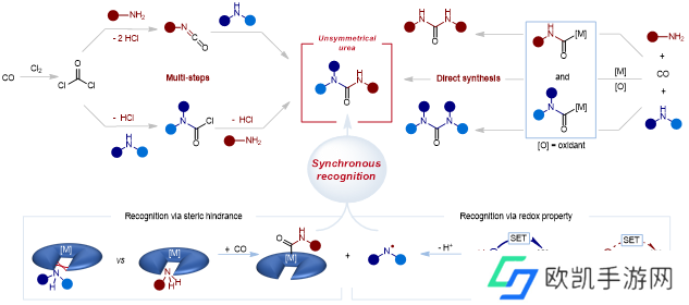 针对这一挑战,科研人员提出了同步胺识别策略:利用位阻效应,实现钴中心识别一级胺 / 氨气发生亲核羰化生成金属-酰基;利用氧化还原性,实现铜中心识别二级胺优先发生电子转移生成自由基。