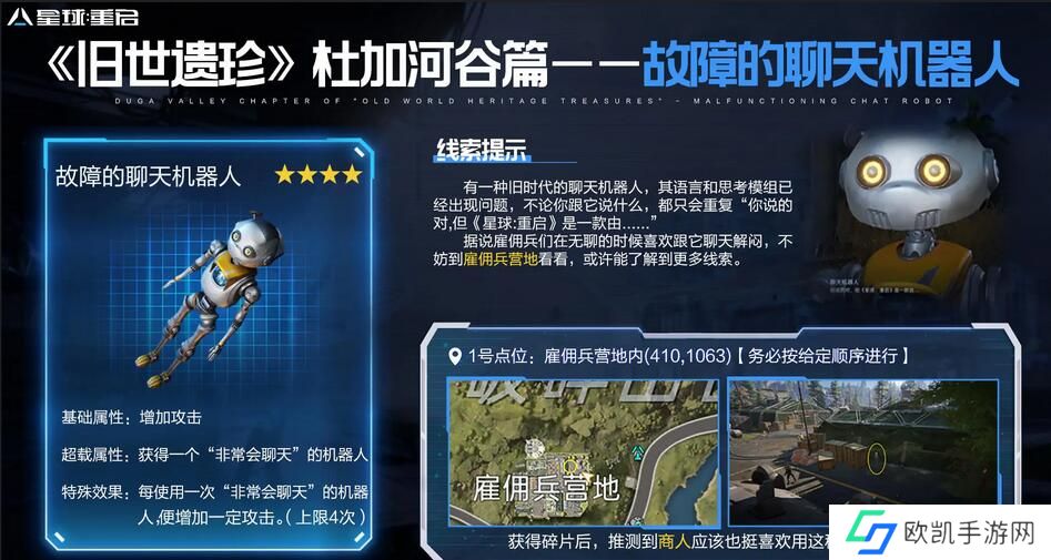 在星球重启游戏中故障的聊天机器人属于旧世遗珍,但是很多玩家不知道星球重启故障的聊天机器人怎么获得,玩家可以在雇佣兵营地内搜集碎片合成,更多详细内容在这篇故障的聊天机器人获得方法介绍中,让我们一起来看看吧。