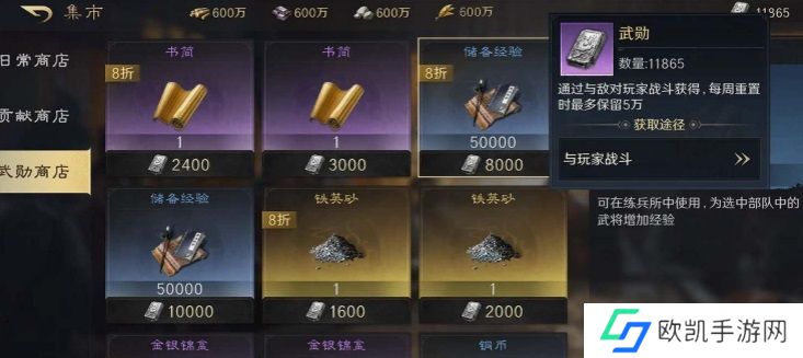 3、在玩家主队3名武将的战法等级都升满后,重点购买预备兵就可以了。预备兵持续消耗且粮食消耗大于产出的时候,可以考虑购买粮食来保证快速征兵功能正常使用。中后期武勋累积较多再考虑购买书简等材料道具。