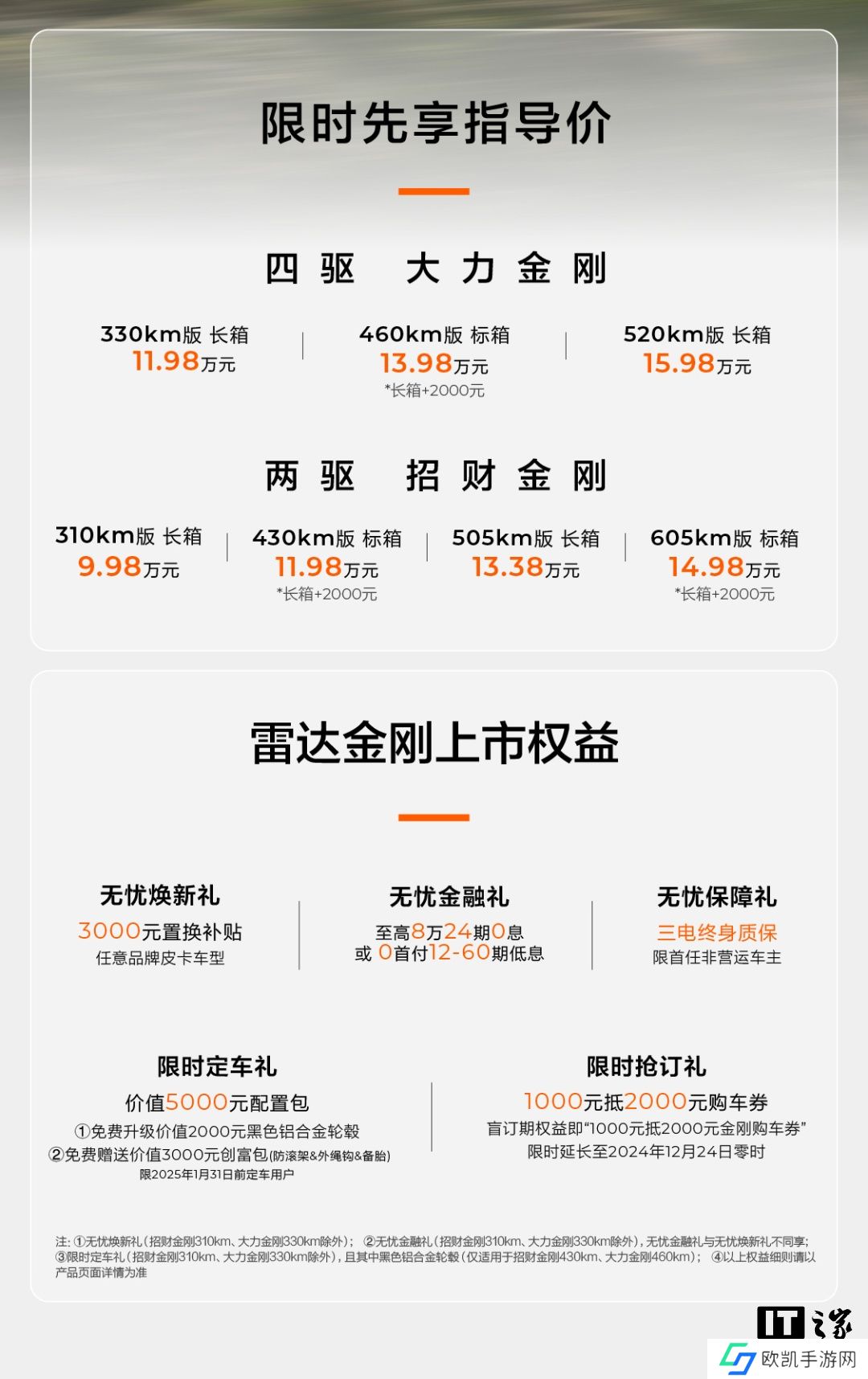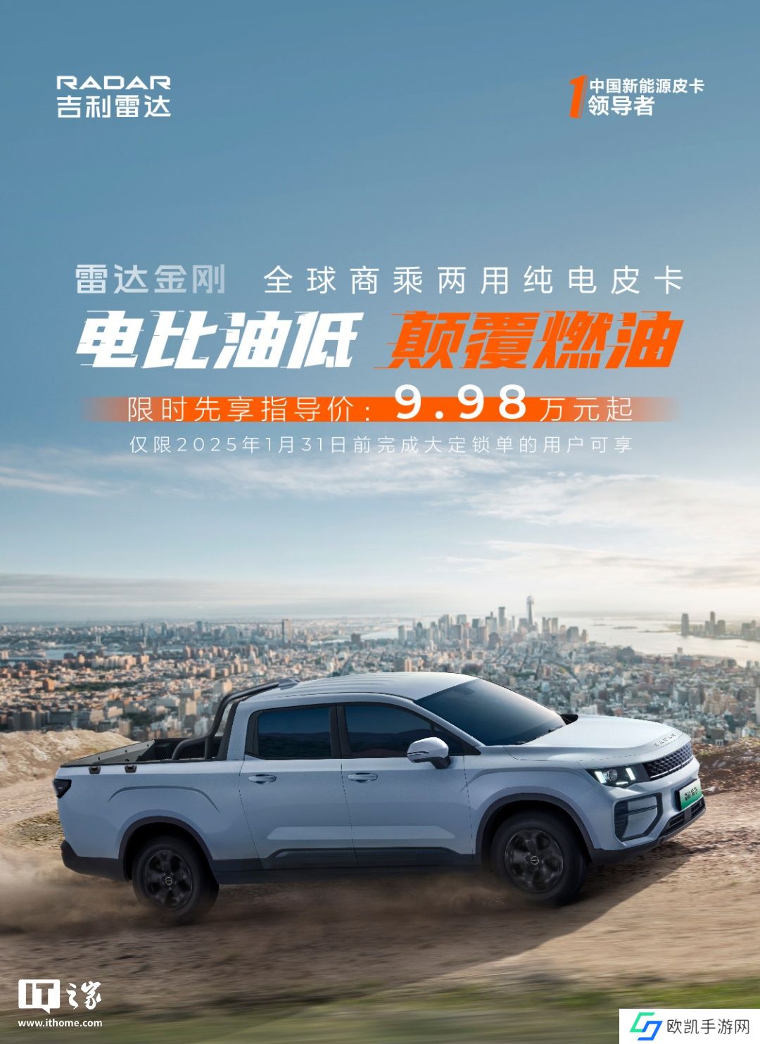 本站 12 月 23 日消息,吉利汽车旗下商用车品牌“雷达”的第二款皮卡车型“金刚”今日正式上市,限时先享指导价9.98 万元起(2025 年 1 月 31 日前完成大定锁单的用户可享)。