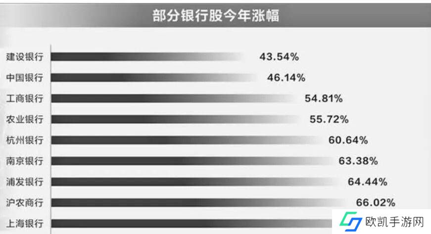 今年以来,所有银行股都获得正收益,涨幅中值约为40%。上海银行涨势最佳,累计大涨73.23%,沪农商行、浦发银行、南京银行、杭州银行等涨幅也超过60%。四大行中,农业银行以55.72%的年度涨幅居首,工商银行、中国银行、建设银行也分别录得54.81%、46.14%、43.54%的涨幅。