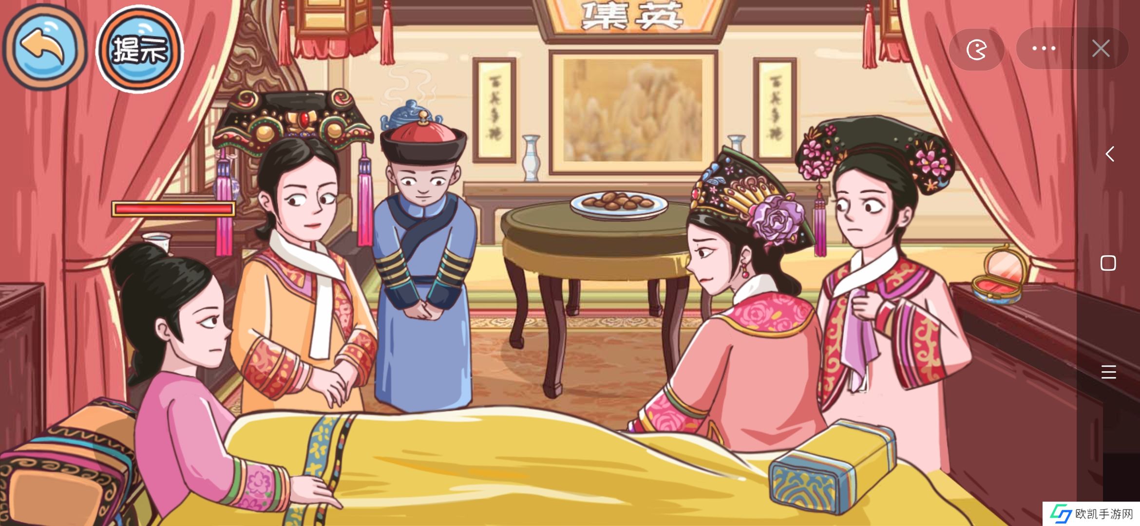 8、画面中心的苦杏仁拖到太监托盘里的扇子上,自动触发动画,通关