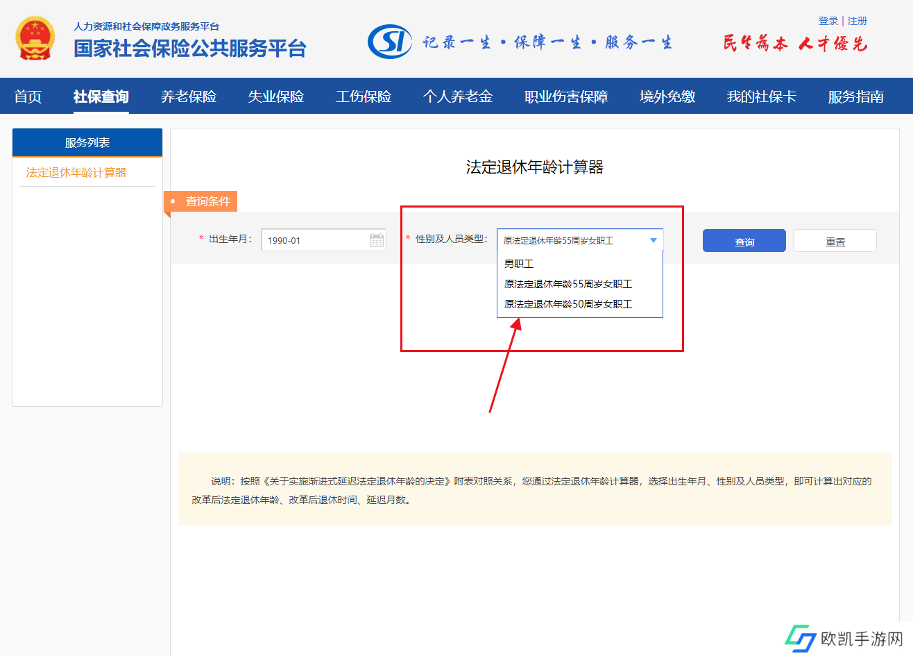 如图所示,您需要填写你的出生年月,这里以1990年1月出生的职工为例;