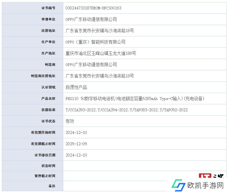本站注意到,OPPO“PKG110”手机已通过 UFCS 融合快充协议认证,从型号来看预计为一加 Ace 5。相关页面显示,新机电池额定容量为 6285mAh,采用 Type-C 接口输入。