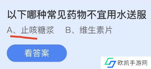支付宝蚂蚁庄支付宝蚂蚁庄园小课堂5月30日的其中一个问题是:以下哪种常见药物不宜用水送服?这道题考查了关于药物的知识,下面一起来看一下蚂蚁庄园5月30日的正确答案吧。