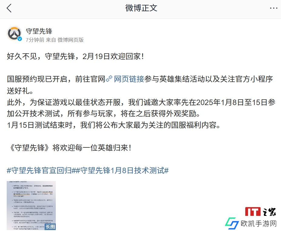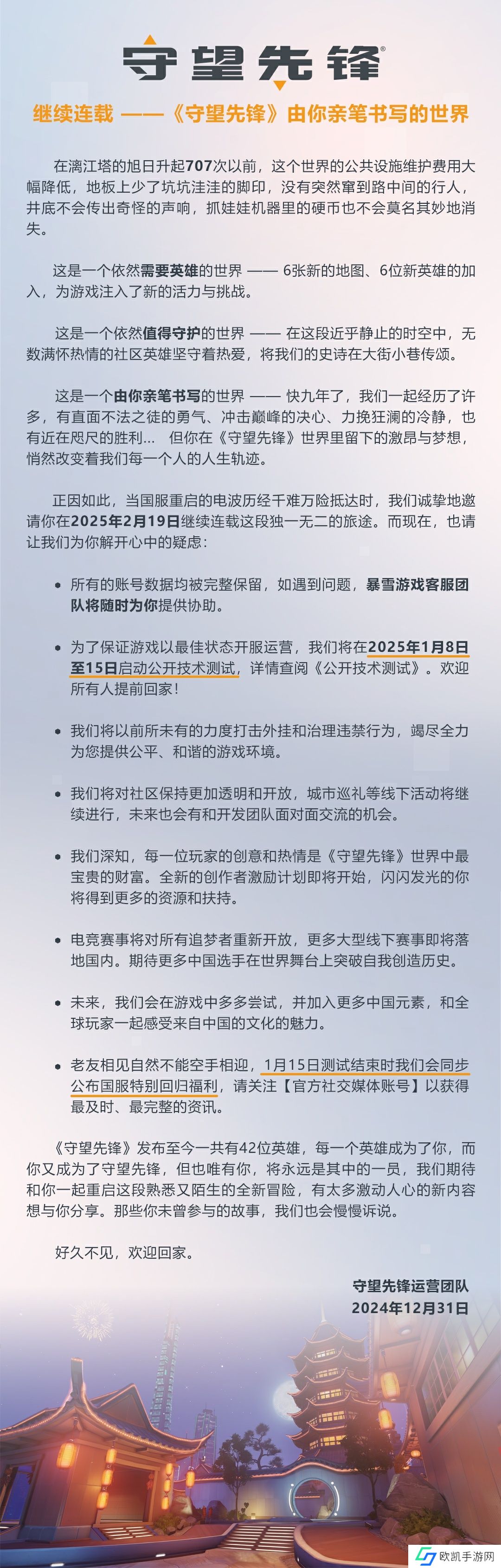 此外,《守望先锋》国服将在2025 年 1 月 8 日至 15 日启动公开技术测试,测试结束后将公布国服福利内容。