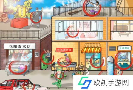 1、避暑怪咖这关要找的12处奇葩避暑行为如图,它们分别是:移动空调、过堂风、冰棺乘凉、冰块烧烤、车载泳池、召唤雨神、靓仔射日、心静自然凉、厕所游泳、人工降雨、头顶阳伞、冰箱狗窝