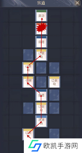 2、宫道:前进-木匣-迷迷仙-木匣-前进-小铜匣-木匣-木匣-前进-敌人-湖边
