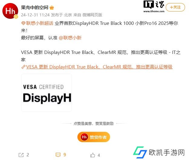 博主@果壳中的空间 今日表示,业界首款 DisplayHDR True Black 1000 笔记本电脑就是即将发布的联想小新 Pro16 2025。