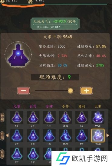 修士的瓶颈难度建议只调高最高境界中期的难度以保持最高战力的强度,其他难度全调成1堆数量;离渡劫比较远时全调成1就行。
