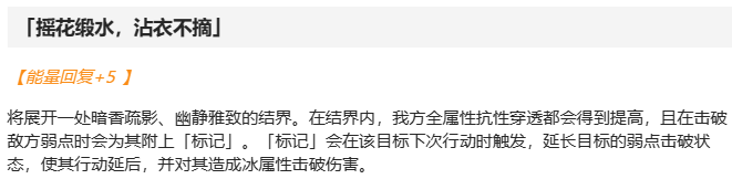 3、阮梅的终结技是摇花缎水,沾衣不摘:在结界内可提高抗性,将地方弱点击破后可附上标记,然后可使其行动延后,并造成冰属性击破伤害。