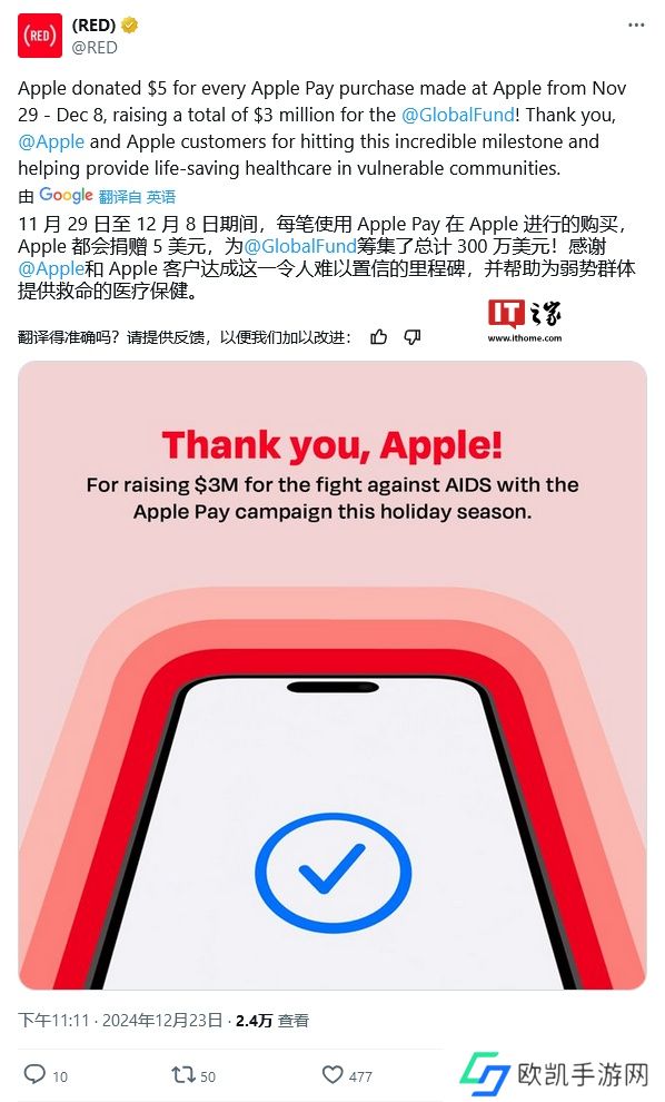 本站 12 月 24 日消息,(RED)昨日在 X 平台发布公告,宣布苹果公司通过年度 Apple Pay 捐款活动,已为全球基金(The Global Fund)筹集了 300 万美元,用于抗击**病、结核病和疟疾。
