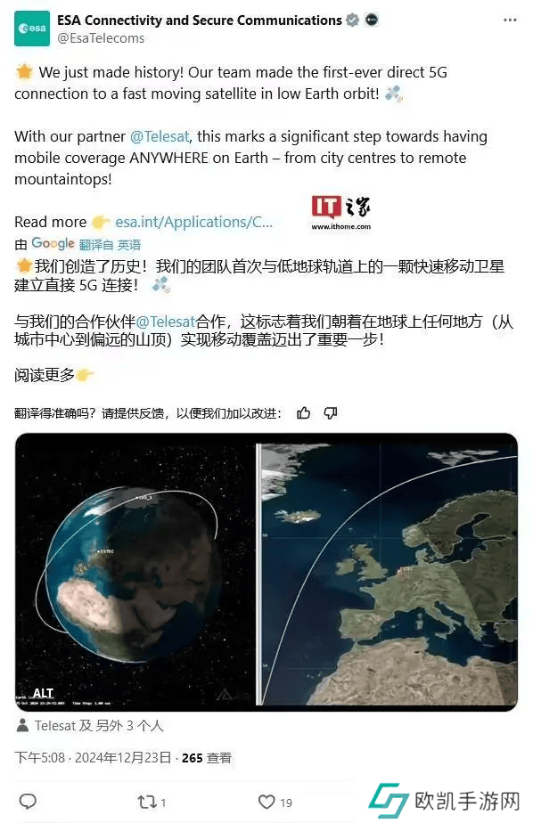 12 月 25 日消息,欧空局(ESA)于 12 月 23 日发布博文,携手加拿大卫星通信公司 Telesat,成功实现全球首个基于低地球轨道(LEO)的 3GPP 非地面网络(NTN)连接,标志着卫星通信技术的重大突破。