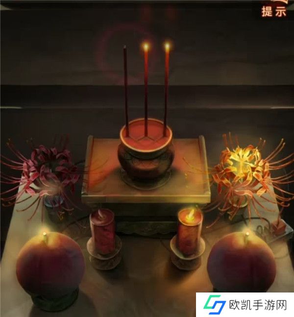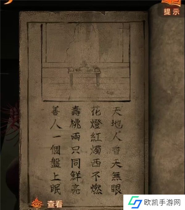 3、暂时没有更多线索,查看一下无字书吧,果然出现了线索,结合供桌上的东西理解一下,香叫天地人,那么天无眼就是天的那根香不要点亮,花灯和红烛西边的不点燃,一般来说上北下南左西右东,也就是左边的不亮,只点右边的,寿桃是两个都要亮的,调整一下供桌上的东西。