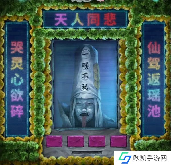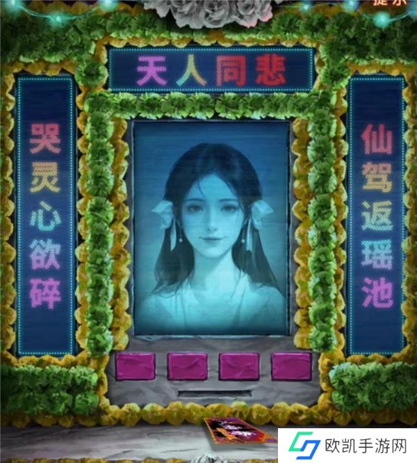 10、出门来到阴阳牢,先使用毛笔在桌子上登记一下吧,登记结束后从牢狱手中拿到女主照片,再次回到剧场,查看一下舞台上色彩斑斓的赛博灵台,点击照片最下面的那个花坛,花坛移动后出现四个按钮和一条缝,对那条缝放入女主照片后就可以开始调整了,第一个按键是中间照片,自然是调整为女主了。第二个按键是左边的对联,第四个按键是右边的对联,我们前面竹简上看到被上包围的字是仙,被下包围的字是碎,也就是左右对联必定有第一个字是仙和最后一个字是碎的,那么能用的对联也只有哭灵心欲碎和仙驾返瑶池了,竹简上被上下划红线的字是天和人,也就是最上面的横批要有天和人字,那么第三个按钮调整的上面只能是天人同悲了,调整好后如下图拿到入场券。