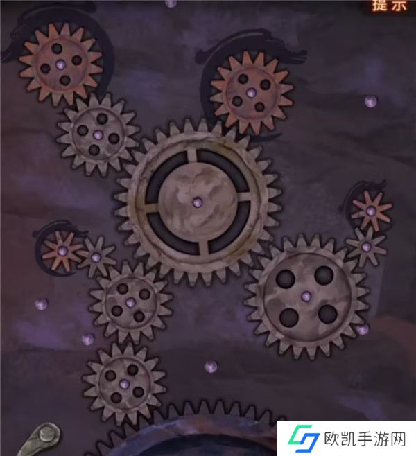 8、查看左边的箱子一样的东西,使用齿轮后可以开始调整,调整一下齿轮位置,注意大齿轮想要移动要先挪开旁边的小齿轮哦,黑色圈圈内的齿轮是无法移动位置的,调整到如下图,让所有齿轮都能转动起来就能开始木偶戏了。