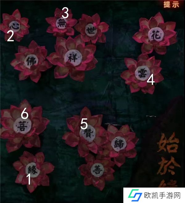 7、注意看完竹简会有小高能,这次进入刚刚打开的门到达剧场,中间位置的荷花上很多字很眼熟啊,我们前面获得过一个菩萨背后电子屏线索,荷花上面写了起于缘,所以就从缘开始,刚好米雪也是从缘开始记录的,顺序是缘心无云赞菩,点击完成后中间出现金色荷花,拿到一根木鱼棒。