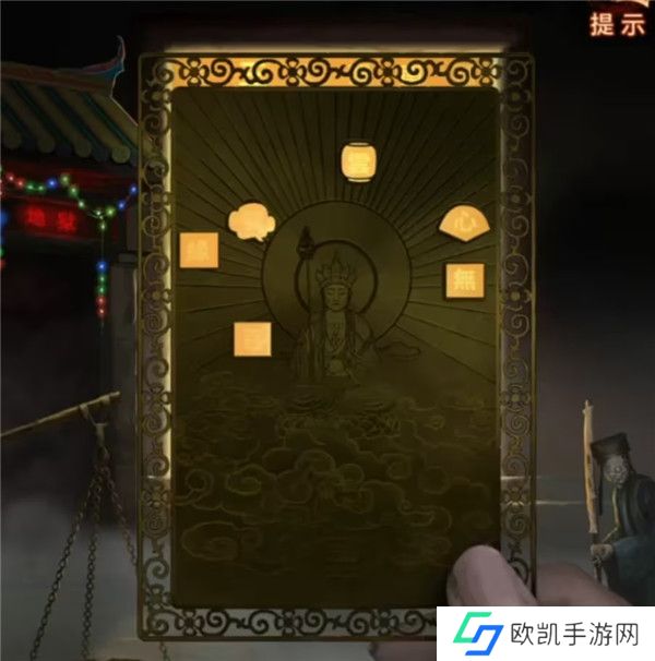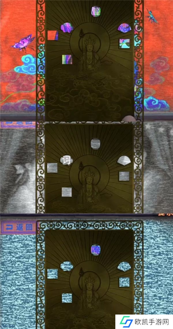2、先拿出带孔的小卡片,果然菩萨后面的背景墙上的字会出现在小孔里面,记一下长方形=缘,云朵=赞,正方形=菩,灯笼=云,扇子=心,又一个正方形=无,因为有相似的图形,所以这个可能不是形状线索,把字亮起的顺序也记下来缘-心-无-云-赞-菩,这里其实是循环亮起的,所以第一个字不一定是缘只是记下顺序而已。