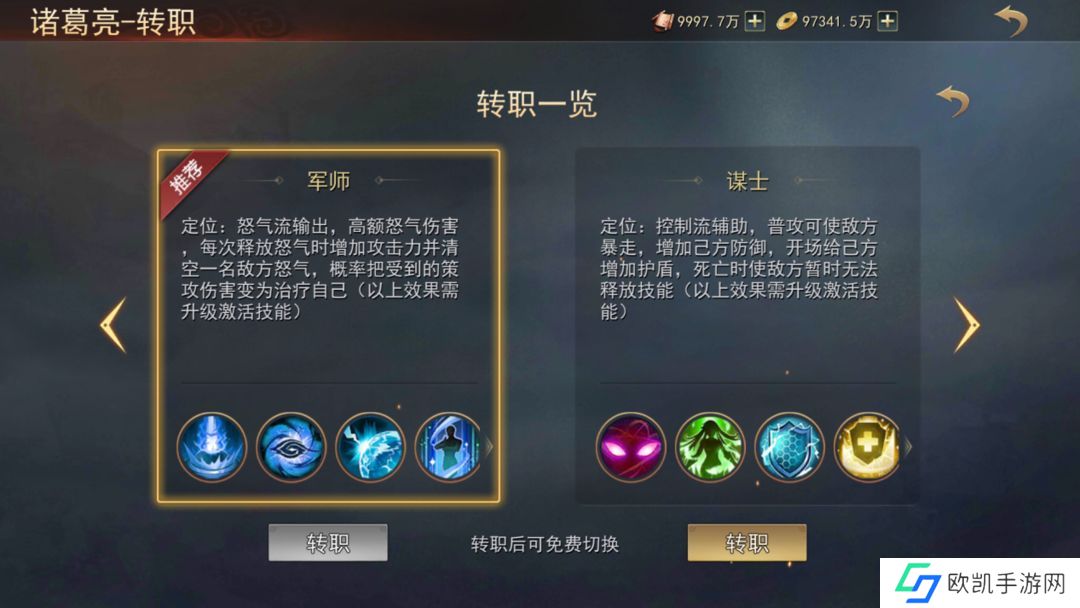 诸葛亮职位分为:军师、谋士军师技能效果:增伤,治疗、免疫、怒气清零谋士技能效果:暴走、移除有害状态、增防、护盾、犹豫