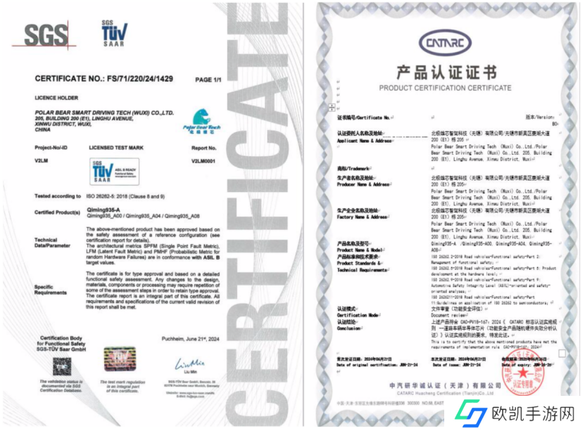 启明 935A 系列已经获得 TüVSGS ISO26262 ASIL-B 级认证。同时获得了中汽研车规级验证,是首个经过国内外双重检验的车规级产品。