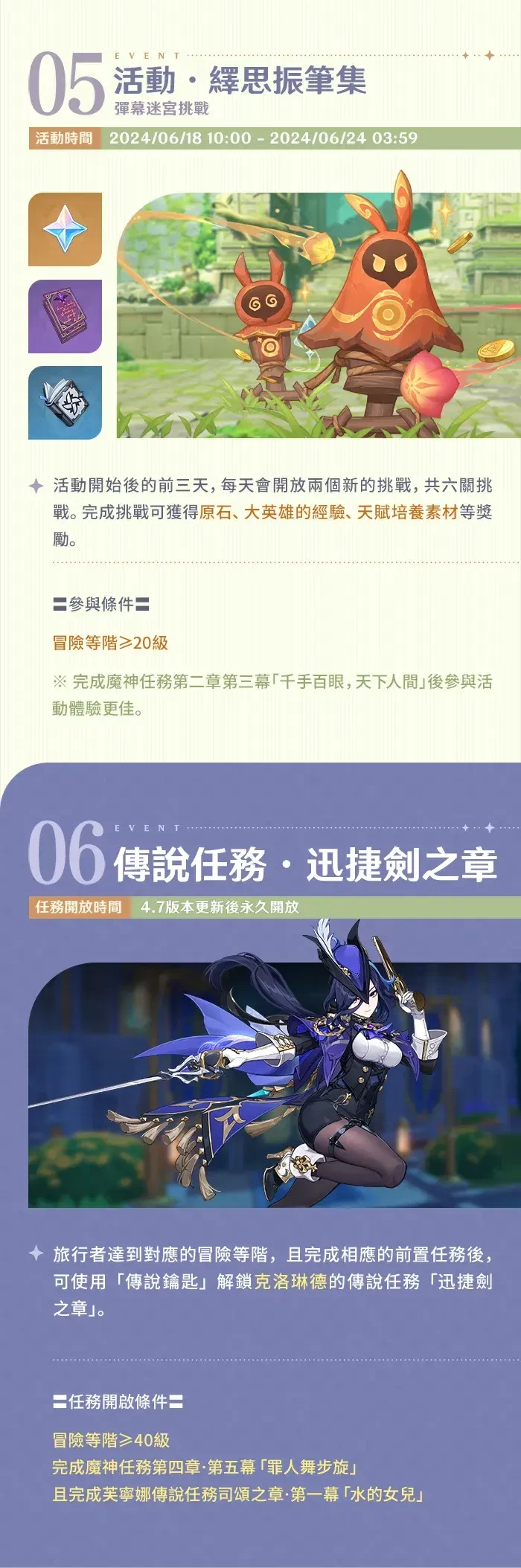 ※祈愿开启期间,还将开启相应的「且试身手」角色试用活动,旅行者可以使用包含试用角色的固定阵容进入指定的关卡进行体验,挑战成功后即可获得对应奖励!