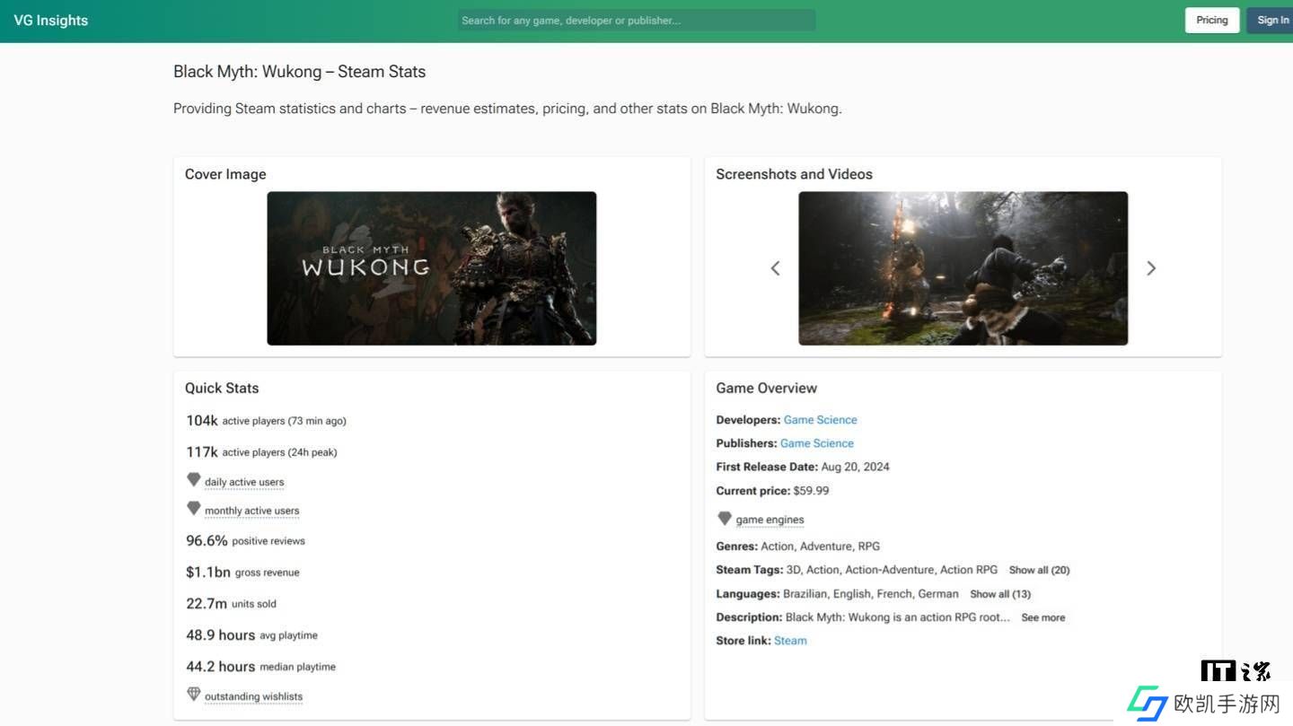 查询游戏数据统计平台 VG Insights 获悉,截至发稿,《黑神话:悟空》在 Steam 平台的销量已经超过 2270 万份,好评率为 96.6%。据了解,《黑神话:悟空》PS5 实体版于 12 月 12 日在北美 / 南美 / 欧洲 / 澳洲地区,将于 2025 年 1 月 16 日在港澳台地区、韩国、东南亚等地发售,有望令游戏销量继续大幅上升。