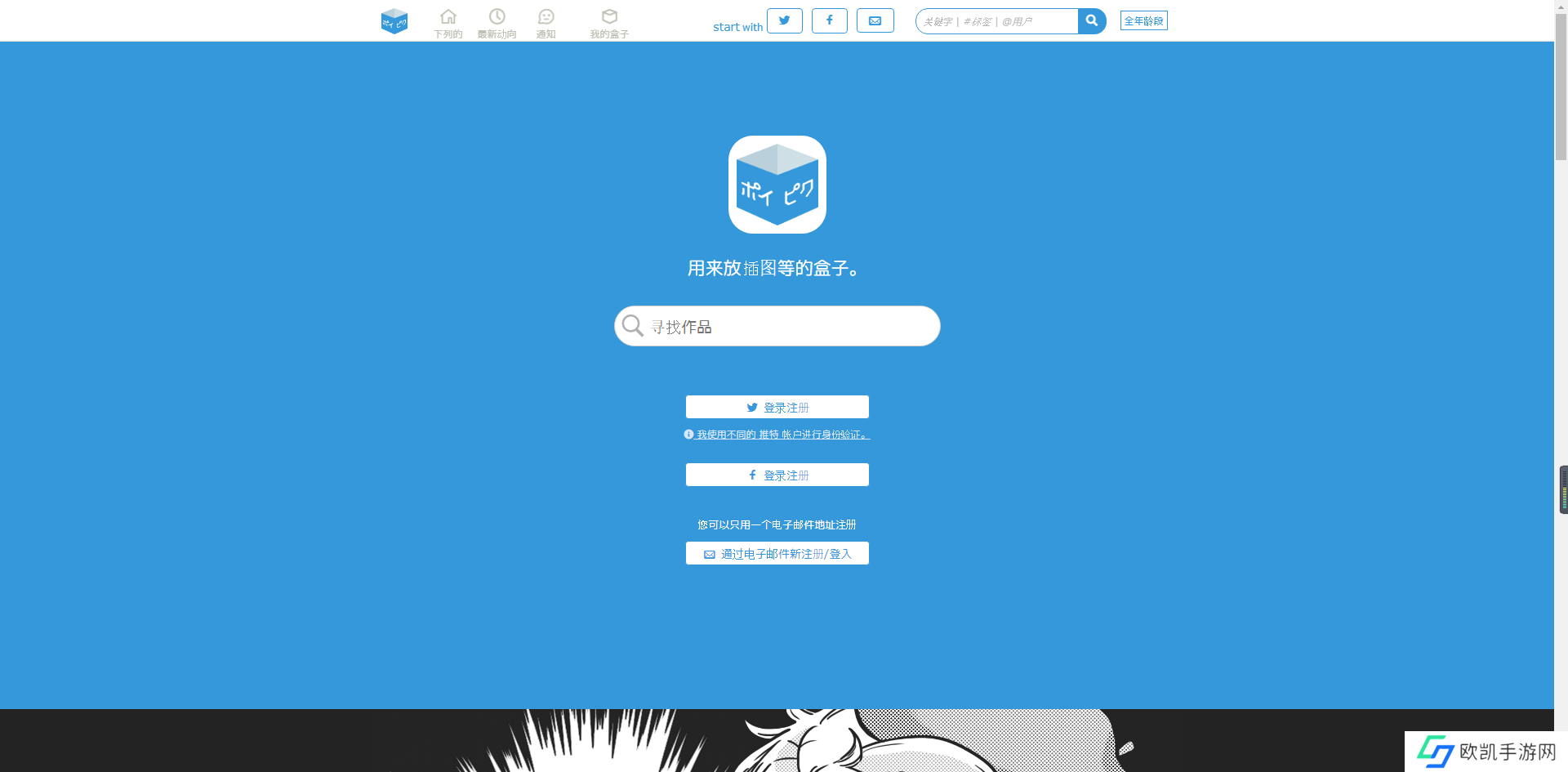 3、如果不想注册,游客形式也可以查看该平台上的插画作品,在首页搜索栏内输入关键字即可查看结果。
