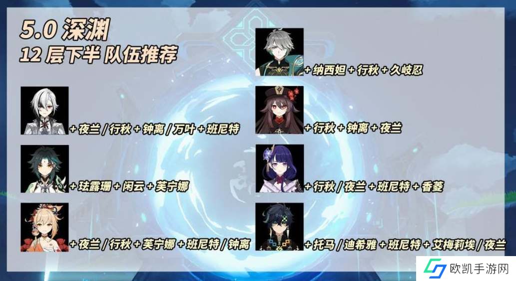 推荐阵容海草行久、仆夜钟班、胡行钟夜、魈珐闲芙、雷国、宵芙夜钟、基托班梅/夜。