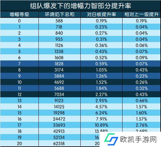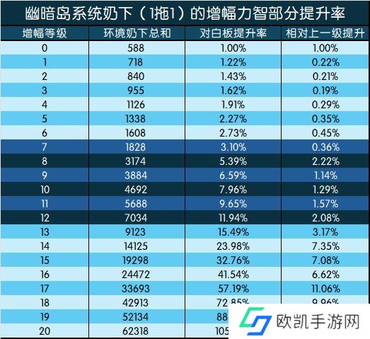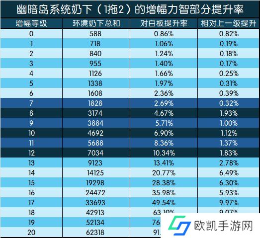 环境奶下指实际单人力智提升量,也就是前一列的4.08倍。增幅0有力智增加的原因是红字只要打上去就有12点四维,以这个标准算的。