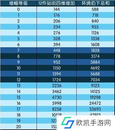考虑到一般而言,我们口中的“红10”、“红11”的标准是全身增幅都达到了这个值。因此这里也列出了12件同等级增幅装备标准下,实际提供的四维收益。国服最主要的增幅段集中在红7到红12之间,这块可以重点看。