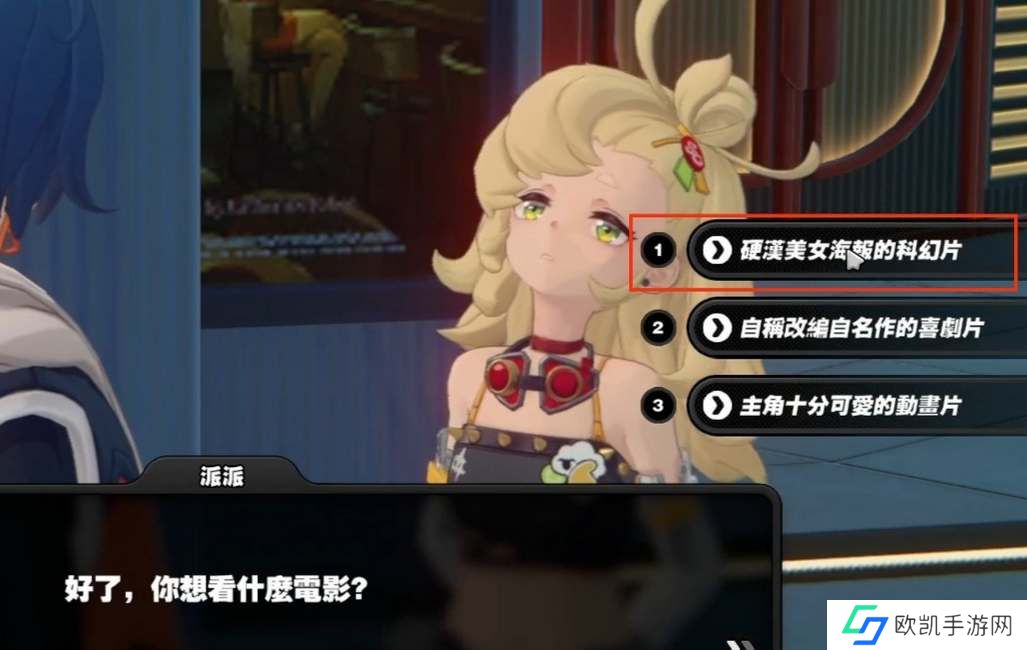 然后前往电影院与派派对话,选择“硬汉美女海报的科幻片”,好感度增加。