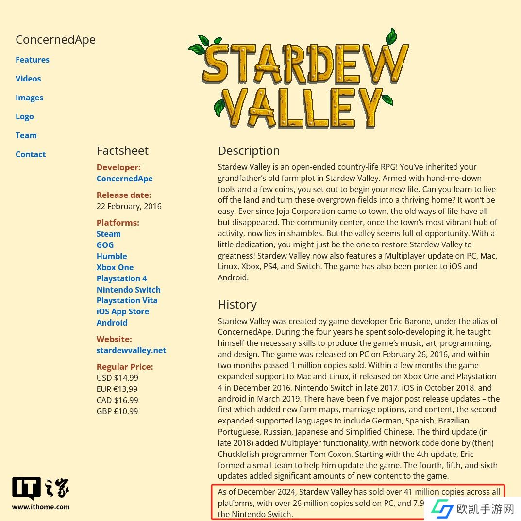 本站 12 月 30 日消息,《星露谷物语》官方更新资料显示,截至 2024 年 12 月,《星露谷物语》在所有平台上的销量已超过 4100 万份,其中 PC 平台销量超过 2600 万份,任天堂 Switch 平台销量为 790 万份。