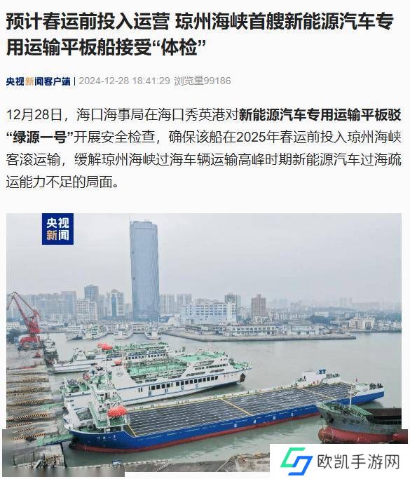 12 月 28 日消息,据央视新闻报道,今日,海口海事局在海口秀英港对新能源汽车专用运输平板驳“绿源一号”开展安全检查,确保该船在 2025 年春运前投入琼州海峡客滚运输,缓解琼州海峡过海车辆运输高峰时期新能源汽车过海疏运能力不足的局面。