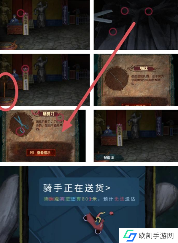 通过线索调整牛头雕像吊饰后,获取粗香和纸剪刀。