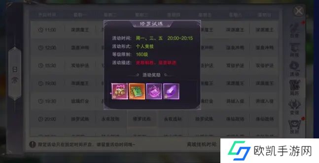 1、修罗试炼:达到160级后每周一、三、五晚上20:00-20:15开启。