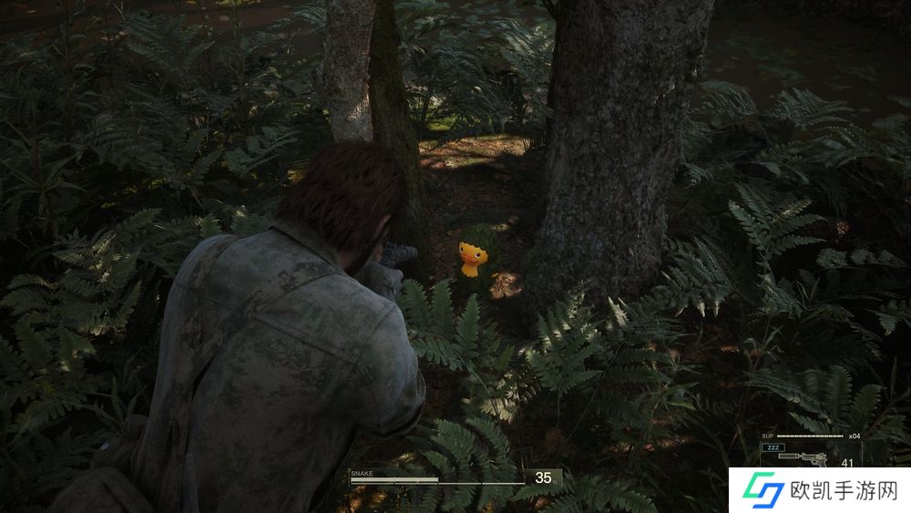为了测试新游戏对原作《MGS3》的死忠程度,我让 Snake 泡进 Dremuchij Swampland 的泥浆中,将他完全包覆起来(我得承认,我前一次尝试的时候意外把他给淹死了)。他整张脸和身体都变成了湿漉漉的棕色,头髮又黏又滑……然后他的伪装指数便达到了极致,连附近的鳄鱼都看不见他。
